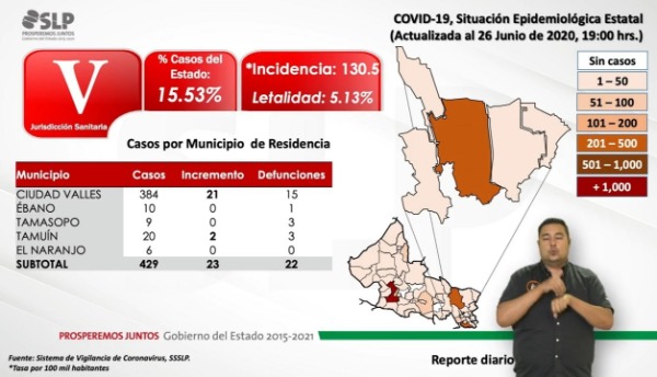 La zona huasteca en las 3 jurisdicciones sanitarias que cubren los 20 municipios que la integran registra 1,079 casos y 56 defunciones; de ellos de la región norte con sede en Ciudad Valles, se tienen 429 casos y 22 defunciones.