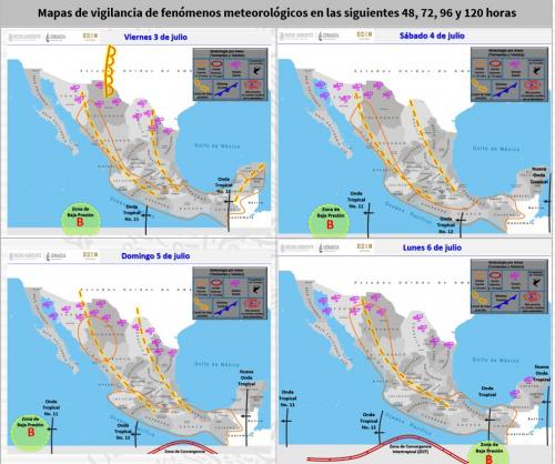 El pronóstico meteorológico para las próximas horas indicia que la onda tropical No. 11 se desplace sobre el sur del país, mientras que la onda tropical No. 12 lo hará sobre el sureste de México, ocasionarán lluvias puntuales muy fuertes acompañadas de descargas eléctricas y posibles granizadas en Chiapas, Oaxaca y Guerrero, así como fuertes en Michoacán, Tabasco, Campeche y Quintana Roo.