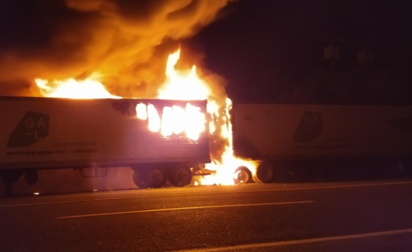 Los dos remolques de un tráiler que estaba vacío, se quemaron por completo, al parecer a causa de un a falla mecánica.
