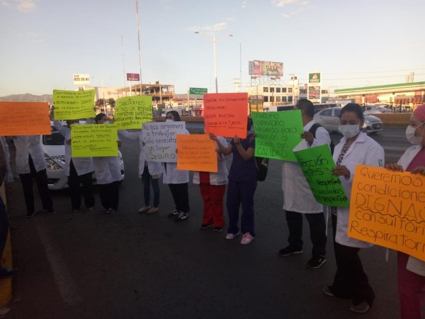 Este lunes personal personal médico en la Clínica 45 del Instituto Mexicano del Seguro Social (IMSS), se manifestó sobre uno de los carriles laterales de la Avenida Salvador Nava para exigir medidas de seguridad en el área de atención de sospechosos de Covid-19.