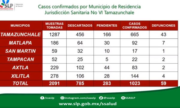 Al actualizar la situación epidemiológica que se presenta en torno al COVID-19 en la Jurisdicción Sanitaria #6, se informó que de los 6 mil 235 casos confirmados que hay en el estado la huasteca sur tiene mil 023 y de las 381 defunciones le corresponde 59, lo que equivale al 15.5%