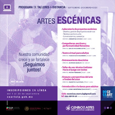 El Centro de las Artes de San Luis Potosí a través de su área de artes escénicas impartirá desde el próximo 28 de septiembre, distintas alternativas virtuales de iniciación y actualización profesional en teatro y danza, mediante las cuales busca ofrecer a la comunidad artística y académica, la continuidad a los programas de formación ofertados de manera regular por la institución.