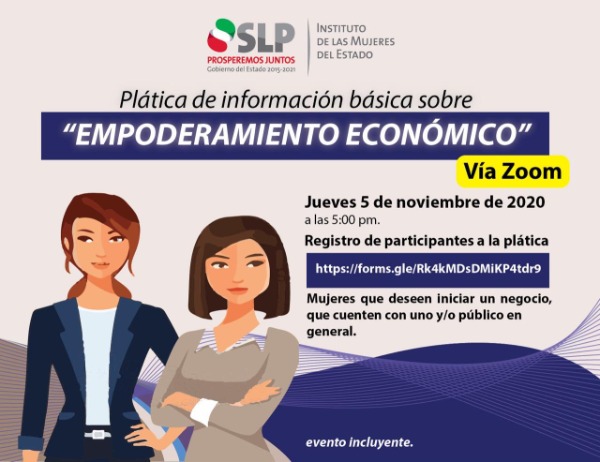 Las personas interesadas podrán registrarse a través del siguiente link https://form.gle/RK4KMDsDMiKP4tdr9Para fomentar el desarrollo económico de las mujeres y su incursión en el mercado laboral, el Instituto de las Mujeres del Estado (IMES), a través del área de capacitación, invita a la plática "Empoderamiento Económico", que se realizará este jueves 5 de noviembre a las 17 horas a través de la plataforma Zoom, informó Erika Velázquez Gutiérrez, titular de la dependencia.