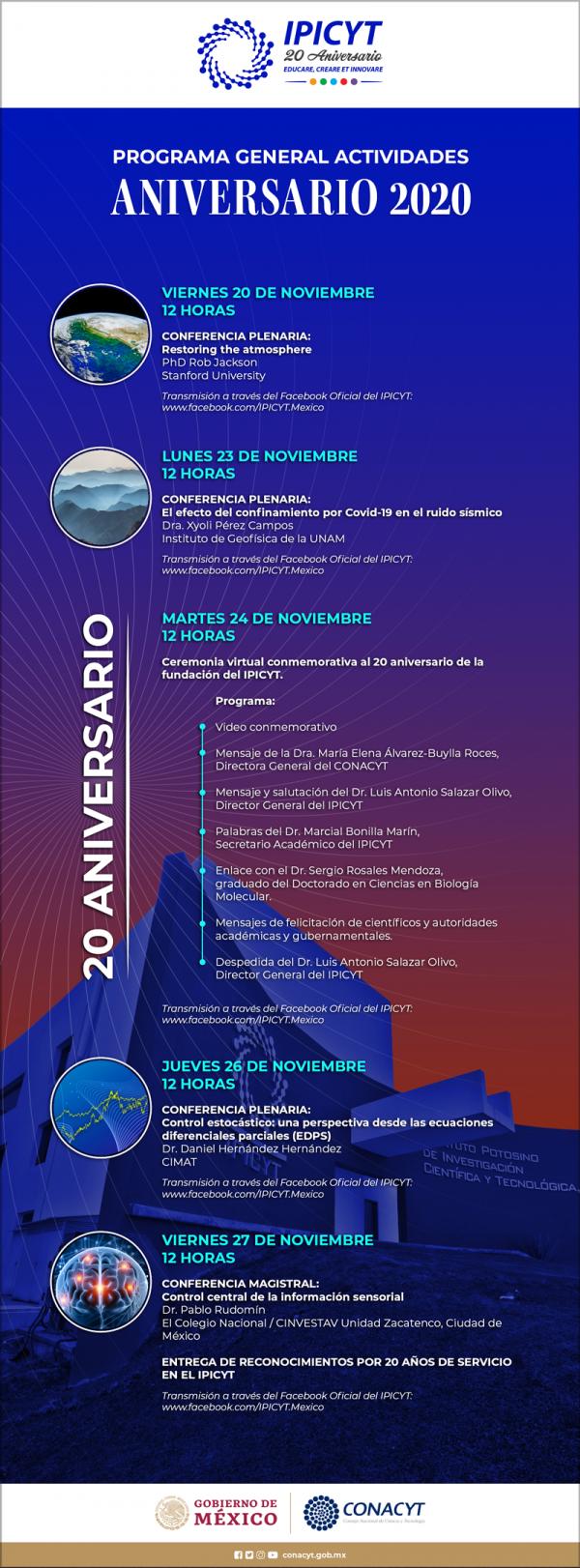 Así mismo, el martes 24 a la misma hora, se realiza la ceremonia virtual de conmemorativa del 20 Aniversario de Fundación del IPICYT, con la participación de la doctora María Elena Álvarez-Buyllá Roces, Directora General del CONACYT.