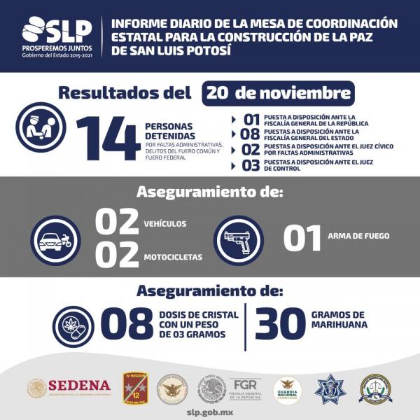 Asimismo, se detalló la detención y puesta en disposición de 14 personas, respectivamente, por diferentes faltas administrativas y probables delitos como portación de arma de fuego, prestación de servicio de pasajeros sin contar con permisos, posesión de droga, portación de un arma prohibida y violencia intrafamiliar.