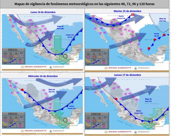 Para hoy, se pronostica que, el Frente Frío No. 20 se extenderá sobre el oriente y sureste del país, ocasionará lluvias puntuales muy fuertes a intensas sobre esas regiones, la masa de aire polar asociada en interacción con un fuerte pulso de la corriente en chorro, ocasionará rachas fuertes de viento sobre el norte y noreste del país, además de ambiente frío a muy frío sobre el norte, centro y oriente de México.