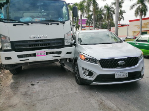 Debido a la falta de precaución, una mujer que conducía un vehículo marca Volkswagen color negro, chocó contra una vagoneta marca Kia color gris, y la proyectó contra un camión estacionado marca Isuzu.