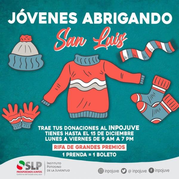 El Instituto Potosino de la Juventud (INPOJUVE), dio inicio a la campaña "Jóvenes abrigando San Luis", que consiste en la donación de suéteres, chamarras, sudaderas y toda prenda de vestir en buenas condiciones, con el objetivo de apoyar a la población vulnerable durante la presente temporada de frío, informó Luis Fernando Molina, titular de la dependencia.