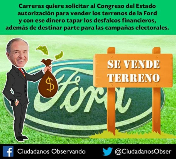 "Estos terrenos fueron adquiridos por el Gobierno del Estado en 1,026 millones de pesos, en su desesperación para poder tapar los enormes boquetes provocados por el desfalco en la Dirección de Pensiones, las corruptelas en los Servicios de Salud y demás dependencias, Carreras quiere ahora vender estos terrenos y así poder agarrar dinero para taparlos y a su vez poder contar con un fuerte monto que se planea destinar ilegalmente a las próximas campañas electorales, donde estará en juego la gubernatura, presidencias municipales y congreso estatal", se lee en la página de los activistas.