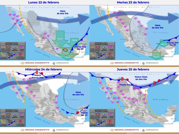Finalmente, el martes, el Frente Frío No. 37 se extenderá sobre el sureste del país y la Península de Yucatán, originando chubascos y lluvias puntuales fuertes en dichas regiones, su masa de aire frío ocasionará ambiente frío a muy frío durante la mañana y noche sobre el noroeste, norte, noreste, oriente y centro de la República Mexicana, así como evento de Norte de corta duración en el Istmo y Golfo de Tehuantepec y la Sonda de Campeche, además de bancos de niebla matutinos a lo largo de la Sierra Madre Oriental y el sureste de México.