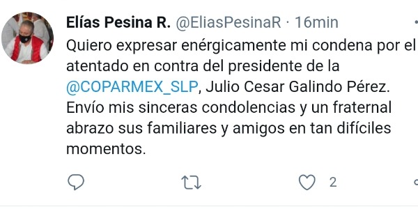 El Partido Revolucionario Institucional (PRI) condena enérgicamente el atentado que sufrió el presidente de la COPARMEX, en San Luis Potosí, Julio César Galindo Pérez, así como toda expresión de violencia ejercida contra la ciudadanía, en menos cabo de su integridad física, así como de la paz y tranquilidad de las familias de nuestra ciudad y de nuestro estado, señaló tajante el presidente del Comité Directivo Estatal de esta instituto Político Elías Pesina Rodríguez.