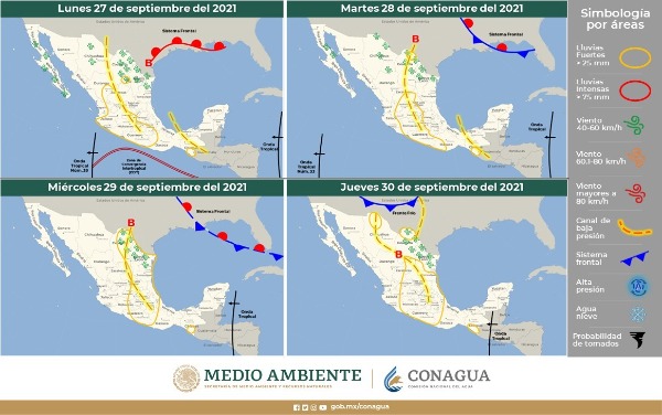 Durante el período de pronóstico, canales de baja presión, entrada de humedad del océano Pacífico e inestabilidad atmosférica superior ocasionarán chubascos y lluvias fuertes a muy fuertes, acompañadas de descargas eléctricas y posibles granizadas sobre entidades del norte, noreste, occidente, centro, oriente, sur y sureste de la República Mexicana.