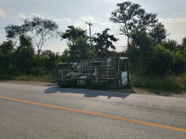 Esta tarde en el kilómetro 6+500 de la carretera federal Valles-Mante, se registró la volcadura de un camión marca Hino color blanco, de la empresa Sello Rojo.
