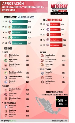 Los resultados del ranking indican que la posición número uno en gobernadores mejor evaluados la ocupa el gobernador de Yucatán, Mauricio Vila con una aprobación de 59.8%; en la posición número dos se encuentra el gobernador de San Luis Potosí, Ricardo Gallardo Cardona con una aprobación del 58.6%; en el tercer lugar se encuentra el gobernador de Sinaloa, Rubén Rocha Moya con 58.3%; en el cuarto el gobernador de Coahuila, Miguel Riquelme con 58.0%, y en el quinto lugar se encuentra el gobernador de Aguascalientes, Teresa Jiménez Esquivel con una aprobación del 57.8%.