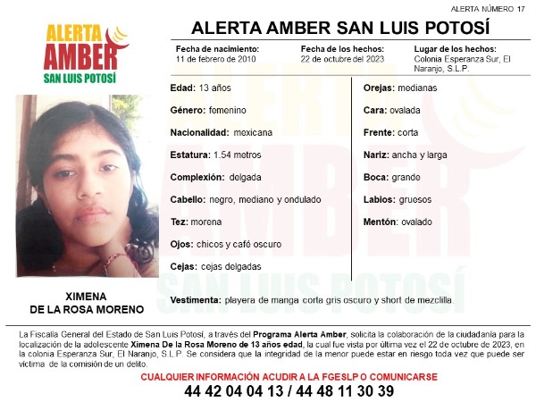 La Fiscalía General del Estado de San Luis Potosí (FGESLP) activa una Alerta Amber para localizar a una adolescente de 13 años de edad en el municipio de El Naranjo.