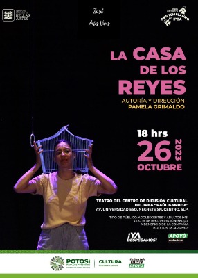 En San Luis Potosí si hay apoyo en cultura para las diferentes expresiones artísticas, por lo que la Secretaría de Cultura de Gobierno del Estado, invita a la puesta en escena "La casa de los reyes", dentro del ciclo de teatro "Contemplando en IPBA" que se llevará a cabo el jueves 26 de octubre a las 18:00 horas en el Teatro del Centro de Difusión Cultural del Instituto Potosino de Bellas Artes "Raúl Gamboa", entrada libre llamando al 55 3024 5939 y antes de la función, en el recinto, el mismo día del evento.