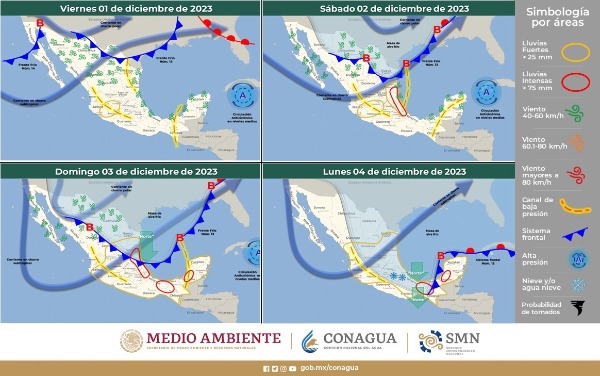 La masa de aire frío asociada al frente generará evento de Norte con rachas de viento de 70 a 90 km/h y oleaje de 2 a 4 metros de altura en el litoral de Tamaulipas, Veracruz y Golfo de Tehuantepec; marcado descenso de las temperaturas diurnas sobre gran parte del territorio nacional, con ambiente matutino y nocturno frío a muy frío y heladas durante las madrugadas sobre el noroeste, norte, centro y oriente del país. Así mismo, durante la madrugada del lunes, se prevé la posible caída de nieve o aguanieve en las cimas montañosas por arriba de 4,200 msnm del centro y oriente del país (Nevado de Toluca, Popocatépetl, Iztaccíhuatl, Sierra Negra, La Malinche, Cofre de Perote y Pico de Orizaba).