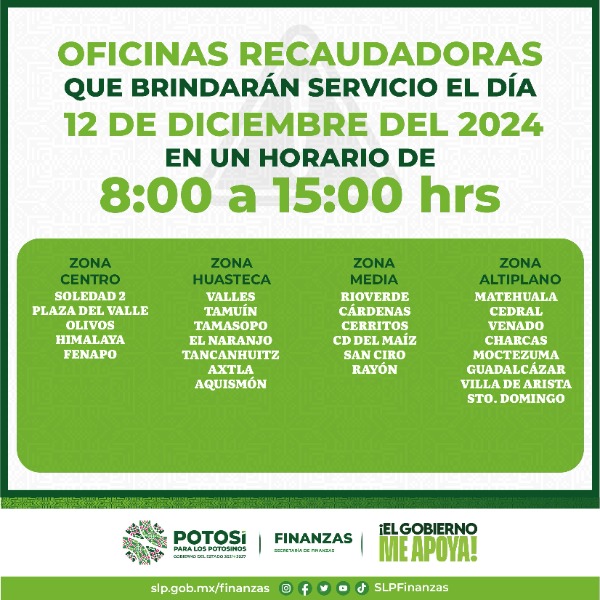 La Secretaría de Finanzas (Sefin) dio a conocer que 26 oficinas recaudadoras de todo el Estado permanecerán abiertas este 12 de diciembre en un horario de 8:00 a 15:00 horas, facilitando que las y los potosinos accedan a trámites vehiculares, con el apoyo del Gobierno del Estado.