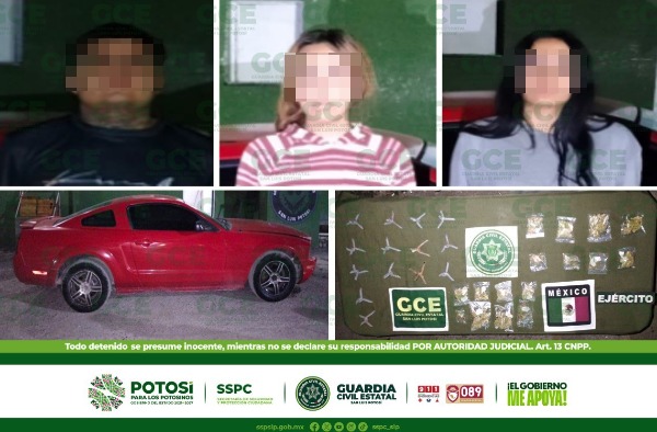 Ante ello, Emilio "N" de 19 años, originario de Tamaulipas, fue detenido, así como Naomi "N" de 20 años y Andrea "N" de 18 años, tras asegurarles 16 dosis de marihuana y un vehículo Ford, línea Mustang, de color rojo.