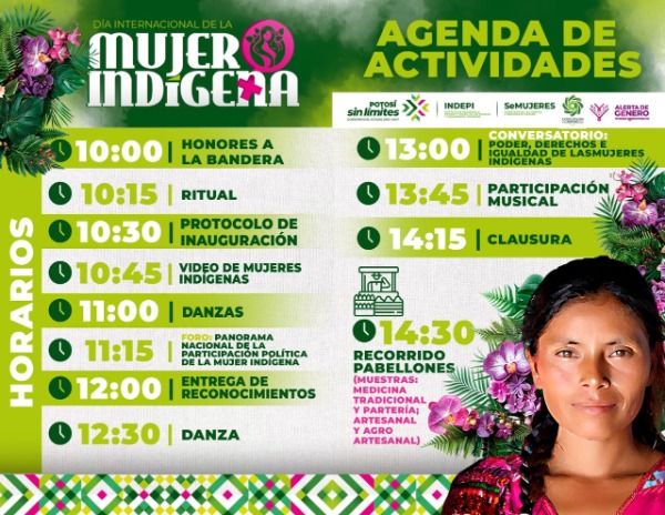 En cumplimiento a la instrucción del Gobernador Ricardo Gallardo Cardona de reconocer la labor de las mujeres indígenas en la defensa de sus derechos y los de sus pueblos, el Instituto de Desarrollo Humano y Social de los Pueblos y Comunidades Indígenas (Indepi), en coordinación con el Gobierno Municipal de Coxcatlán y la Secretaría de las Mujeres e Igualdad Sustantiva (Semujeres), realizará un evento conmemorativo por el Día Internacional de la Mujer Indígena el viernes a partir de las 10:00 horas.