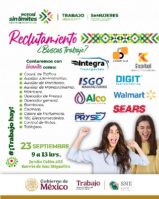 La Secretaría de las Mujeres e Igualdad Sustantiva (Semujeres), en coordinación con la Secretaría del Trabajo y Previsión Social (STPS) y el Servicio Nacional de Empleo (SNE), realizará la quinta Jornada de Reclutamiento Laboral el próximo martes 23 de septiembre en sus instalaciones ubicadas en Jardín Colón 23, barrio de San Miguelito, de 9:00 a 13:00 horas.