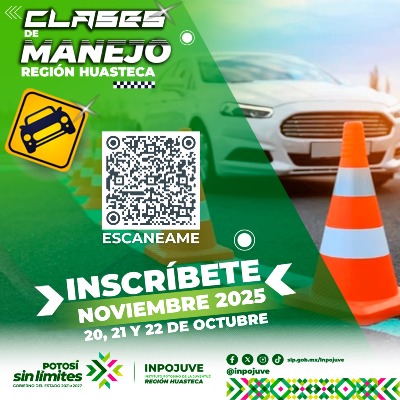 El Gobierno del Estado, encabezado por Ricardo Gallardo Cardona, fomenta la educación vial sin límites, a través del Instituto Potosino de la Juventud (Inpojuve), abriendo inscripciones para las clases de manejo en la Huasteca durante el mes de noviembre. Las inscripciones se realizarán del 20 al 22 de octubre en las oficinas de la dependencia en la región, ubicadas en calle Morelos 104 interior L9, zona centro de Ciudad Valles.