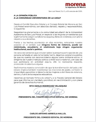 Desde el Comité Ejecutivo Estatal y el Consejo Estatal de Morena, enfatizaron su compromiso con la transformación del estado y del país, señalando que esta también implica erradicar la impunidad y garantizar los derechos humanos. Hicieron un llamado firme a la UASLP y a la Fiscalía General del Estado para que continúen con las investigaciones sin revictimización y respetando plenamente los derechos de las víctimas.