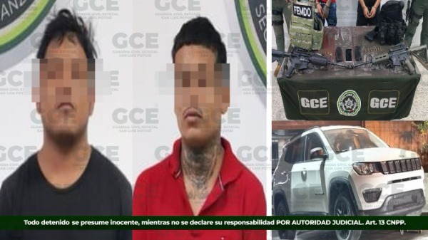 Los detenidos ocupaban un Jeep Compass color blanco modelo 2018 con reporte de robo. Tras repeler la agresión y una persecución, se aseguraron dos armas largas, dos cargadores, 20 cartuchos calibre 5.56 y dos chalecos porta placas. Se confirmó que Javier "N" cuenta con antecedentes por delitos contra la salud.