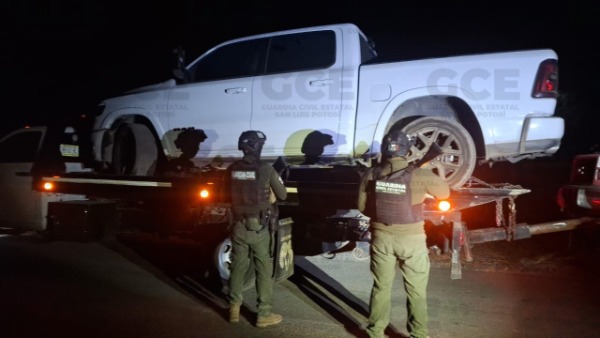 Así mismo, un vehículo Mitsubishi (desvalijado en estado de abandono), modelo 2017 con placas de Nuevo León, un vehículo GMC (desvalijado en estado de abandono), con placas de Nuevo León, dos remolques auto tanques cisterna, modelo 2023, con capacidad de 63 mil litros con reporte de robo del 01 abril del 2025, en carretera 80 km 32, comunidad El Mezquital, Villa de Arriaga. Una maquinaria motoniveladora, Caterpillar con reporte de robo y un Dolly en color gris.
