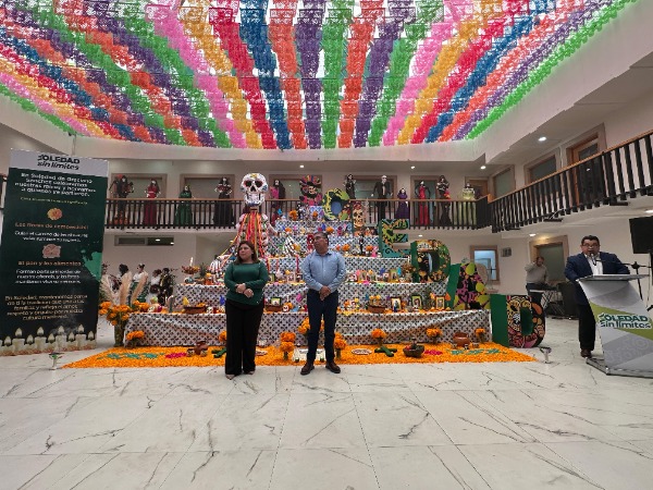 Juan Manuel Navarro Muñiz, Alcalde de Soledad de Graciano Sánchez, inauguró, este martes, el Altar de Muertos Monumental instalado en en el interior de la Presidencia Municipal, que este año se encuentra dedicado a la memoria de las y los trabajadores municipales que ya partieron, como un reconocimiento a su entrega y servicio al pueblo soledense; esta ofrenda es parte de la Festividad de Muertos 2025, que desde el pasado jueves ha llenado de color y tradición las calles con comparsas y actividades culturales.