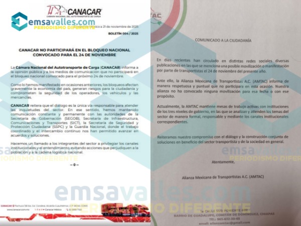 Por su parte, la CANACAR (Cámara Nacional del Autotransporte de Carga) rechazó sumarse al llamado "bloqueo nacional", argumentando que ese tipo de acciones afectan la economía, ponen en riesgo a la ciudadanía y comprometen la seguridad de operadores y mercancías.