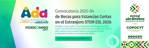 El Consejo Potosino de Ciencia y Tecnología (Copocyt) lanzó la Convocatoria 2025-04 de Becas para estancias cortas en el extranjero "STEM ESL Program for High School Students 2026", dirigida a estudiantes mujeres de preparatoria participantes o egresadas de ADA, Programa de fortalecimiento en STEM+. Esta iniciativa busca ofrecer experiencias de aprendizaje internacional que amplíen las capacidades académicas y personales de las jóvenes, reflejando la visión del Gobernador Ricardo Gallardo Cardona de impulsar oportunidades educativas sin límites.