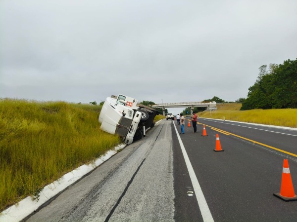 Un camión ganadero terminó volcado a un costado del libramiento Valles-Tamuín, luego de que su operador perdiera el control mientras avanzaba por la carretera de cuota.