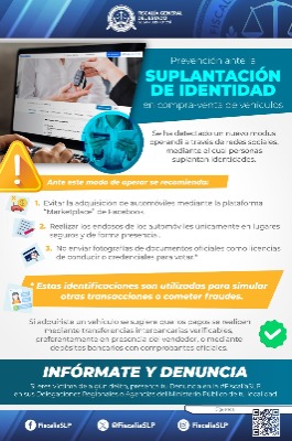 La Fiscalía General del Estado de San Luis Potosí (FGESLP) advierte a la ciudadanía sobre un nuevo método delictivo detectado en redes sociales, mediante el cual personas suplantan identidades utilizando documentos oficiales obtenidos durante supuestas transacciones de compra-venta de vehículos.
