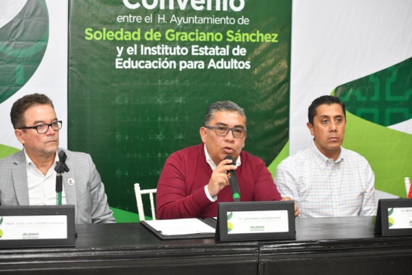Juan Manuel Navarro Muñiz, Alcalde de Soledad de Graciano Sánchez, firmó este miércoles un convenio de colaboración con el Instituto Estatal de Educación para Adultos (IEEA), para fortalecer la atención educativa de jóvenes y personas adultas, en un contexto donde el municipio presenta ya uno de los niveles más bajos de rezago en el Estado potosino, consolidando así el avance sostenido de Soledad hacia la erradicación del analfabetismo y colocándolo en la antesala de convertirse en el primer municipio del país en levantar bandera blanca, como muestra del compromiso permanente de un gobierno cercano que escucha y atiende a las familias.