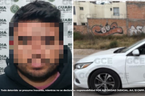 Efectivos de la GCE se desplegaron por diferentes zonas y detectaron a un masculino, a bordo de un automóvil, sobre la colonia Rancho Blanco, en el municipio de Soledad de Graciano Sánchez. Por no poder comprobar ser dueño del automotor Nissan Sentra, modelo 2022, color blanco, fue detenido Carlos "N" de 34 años de edad, tras corroborar que la unidad tenía reporte de robo en Querétaro.