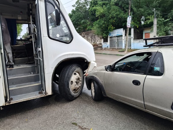En este punto, un vehículo Chevrolet Astra colisionó contra un autobús urbano que realizaba maniobras en el área escolar.