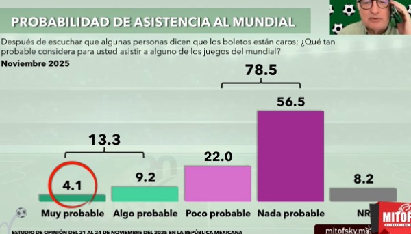 La medición también reveló un alto nivel de desconfianza respecto a la preparación del país. Solo 18% considera que los estadios mexicanos están listos para recibir partidos mundialistas, una percepción que se mantiene baja desde meses atrás. Además, ni una sola persona encuestada opinó que los boletos para los partidos sean accesibles, lo que reduce las posibilidades de asistencia, únicamente 4% ve probable poder ir a un juego en vivo.