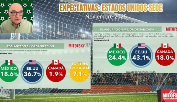 Mitofsky también registró que crece la idea de que el próximo campeón será europeo, debido a la caída en expectativas sobre Brasil y Argentina y el repunte de Alemania e Inglaterra. Pero más allá del favorito, la encuesta dejó claro que cada país ofrecerá algo distinto, Estados Unidos pondrá la organización y los estadios, Canadá la seguridad, y México una inauguración espectacular y el ambiente que siempre caracteriza a la afición.