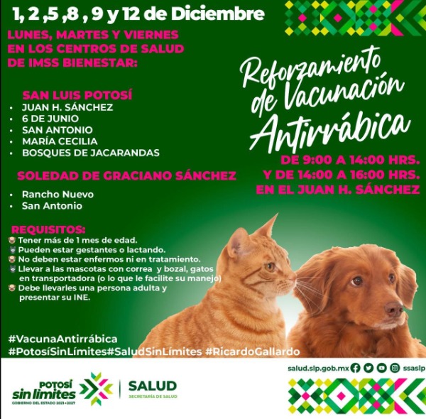 A partir del lunes 1 de diciembre, personal de los Servicios de Salud, en coordinación con IMSS Bienestar, el Instituto Potosino de la Juventud, los ayuntamientos de Soledad, Villa de Pozos, San Luis Potosí y las Delegaciones Bocas y La Pila, así como la comunidad de Escalerillas e instancias públicas y veterinarias privadas, activarán diversos puntos de vacunación. Además del servicio habitual en el Hospital y Refugio Huellitas cada miércoles, durante diciembre se aplicarán vacunas de lunes a viernes de 9:00 a 14:00 horas, y el domingo 7 de diciembre en Tequis y bulevar Río Españita.