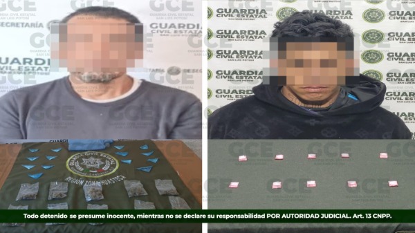 En la zona metropolitana, los oficiales de la GCE detuvieron a Andrés "N" de 22 años de edad, luego de asegurarle 10 dosis de metanfetaminas, resultado de las labores de inteligencia en la zona; mientras que, en el municipio de Tamasopo, agentes estatales informaron la detención de José "N" de 50 años, tras asegurarle 10 bolsas con marihuana y 14 de "cristal".