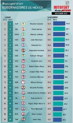 El Gobernador de San Luis Potosí, Ricardo Gallardo Cardona, se mantiene en los primeros lugares del ranking nacional de aceptación ciudadana elaborado por Consulta Mitosfky y en la evaluación del mes de noviembre subió su puntaje con respecto al mes anterior para colocarse en el segundo lugar con 55.8 puntos porcentuales.