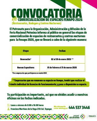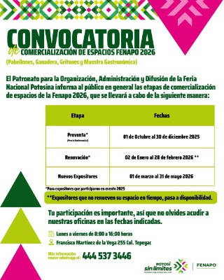 El Patronato para la Organización, Administración y Difusión de la Feria Nacional Potosina (Fenapo) informó que avanza la convocatoria para la comercialización de espacios de la Fenapo 2026, la cual forma parte de la visión de crecimiento y proyección sin límites del máximo evento de las y los potosinos.
