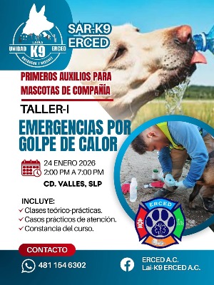Víctor Hugo Torres Otero, presidente de ERCED Ciudad Valles, informó que esta capacitación será impartida por la Unidad Canina de Búsqueda y Rescate, como parte de un curso-taller abierto que busca dotar a los dueños de mascotas de conocimientos básicos para identificar signos tempranos y graves de golpe de calor, brindar atención inicial y canalizar oportunamente a los animales a una clínica veterinaria.