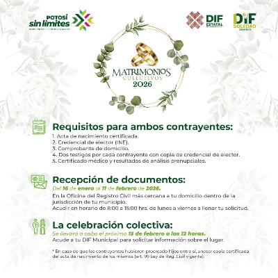 Con el objetivo de fortalecer el valor de la familia y ofrecer protección legal a las parejas, en el marco del Día del Amor, el Ayuntamiento de Soledad de Graciano Sánchez, a través del Sistema Municipal para el Desarrollo Integral de la Familia (DIF), llevará a cabo su programa "Matrimonios Colectivos 2026", un programa en coordinación con el Sistema Estatal DIF, mediante el cual las parejas pueden unirse legalmente sin costo alguno.