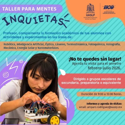 El Instituto de Investigación en Comunicación Óptica (IICO) de la UASLP mantiene abierta la convocatoria para participar en el "Taller para mentes inquietas", correspondiente al semestre febrero-julio 2026, dirigido a grupos escolares de nivel básico, medio superior o equivalente.