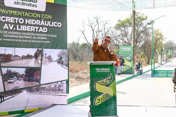 Juan Manuel Navarro Muñiz, Alcalde de Soledad de Graciano Sánchez, realizó este lunes el corte de listón inaugural para la entrega de la obra de pavimentación con concreto hidráulico e instalación de alumbrado tipo led de la avenida Libertad, en el tramo de avenida Valentín Amador a calle Cigüeñas, en el fraccionamiento El Morro, con una inversión de más de 9.5 millones de pesos; importante renovación que beneficia de manera directa e indirecta a más de 26 mil habitantes, para fortalecer la movilidad urbana, la seguridad pública, la calidad de vida y el dinamismo económico local.