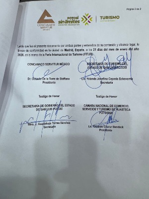 El documento fue firmado por el Dr. Octavio de la Torre de Steffano, Presidente de CONCANACO SERVYTUR México, y la Lic. Yolanda Josefina Cepeda Echeverría, Secretaria de Turismo del Estado de San Luis Potosí, contando como testigos de honor el Mtro. J. Guadalupe Torres Sánchez, Secretario de Gobierno del Estado de San Luis Potosí, y el Ing. Gerardo Charur Bendeck, Presidente de la Cámara Nacional de Comercio, Servicios y Turismo de la Huasteca Potosina.