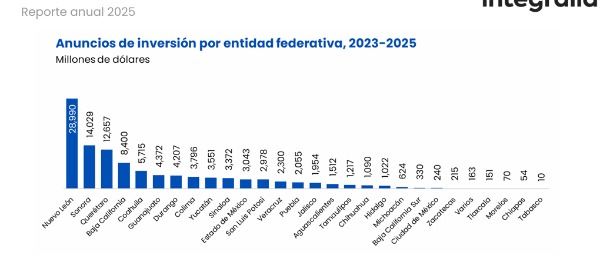 En el rubro de anuncios de inversión por entidad federativa entre 2023 y 2025, San Luis Potosí ocupó el lugar 12 a nivel nacional, con un monto acumulado de 2 mil 978 millones de dólares, superando a estados como Veracruz, que registró 2 mil 300 millones, y apenas por debajo del Estado de México, con 3 mil 043 millones. El primer lugar lo encabezó Nuevo León, con 28 mil 990 millones de dólares. Estas cifras reflejan que, pese a la volatilidad internacional y los cambios en el TMEC, el estado potosino se mantuvo atractivo para la inversión extranjera.