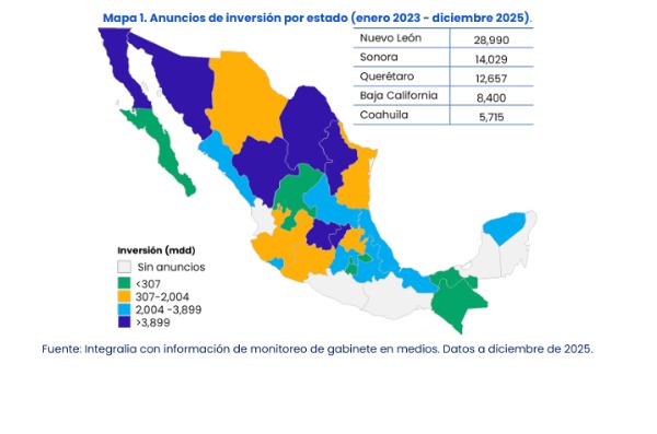 A nivel nacional, entre 2023 y 2025 se registraron 242 inauguraciones de proyectos de inversión, con un valor total de 16 mil 899 millones de dólares y una generación estimada de 111 mil 217 empleos calificados, principalmente en el sector manufacturero.